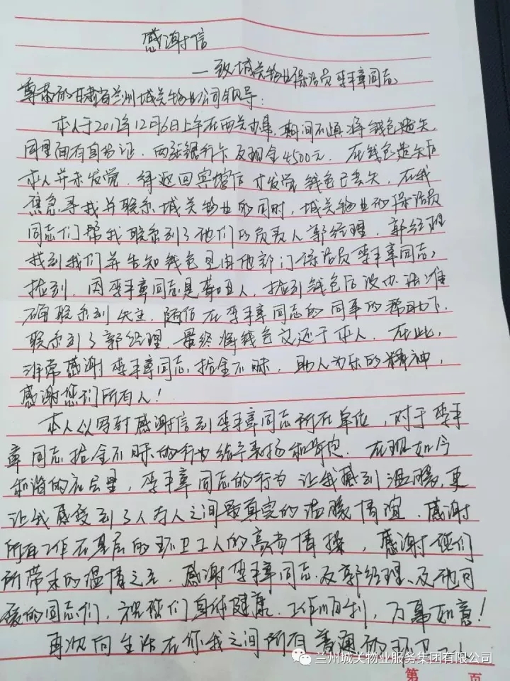 “在現(xiàn)如今和諧的社會里,李平章同志的行為讓我感到溫暖,更讓我感到了人與人之間最真實的溫暖情誼。感謝所有工作在基層的環(huán)衛(wèi)工人的高尚情操!”這是失主王先生在給城關(guān)物業(yè)張掖路項目部寫來的感謝信中的一段話。