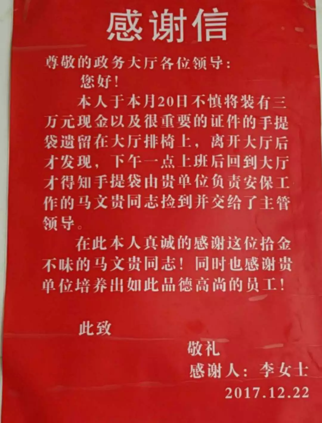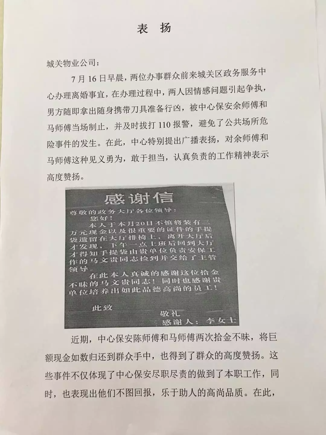 7月16日,城關物業(yè)秩序維護員馬文貴和余會明在城關區(qū)政務服務大廳,見義勇為,奪刀救人;去年12月20日,馬文貴和程斌也在這里拾金不昧,物歸原主。城關區(qū)政務服務中心和當事人都心懷感激,寫了感謝信給他們。感謝他們時時刻刻維護著他人的生命和財產(chǎn)安全。