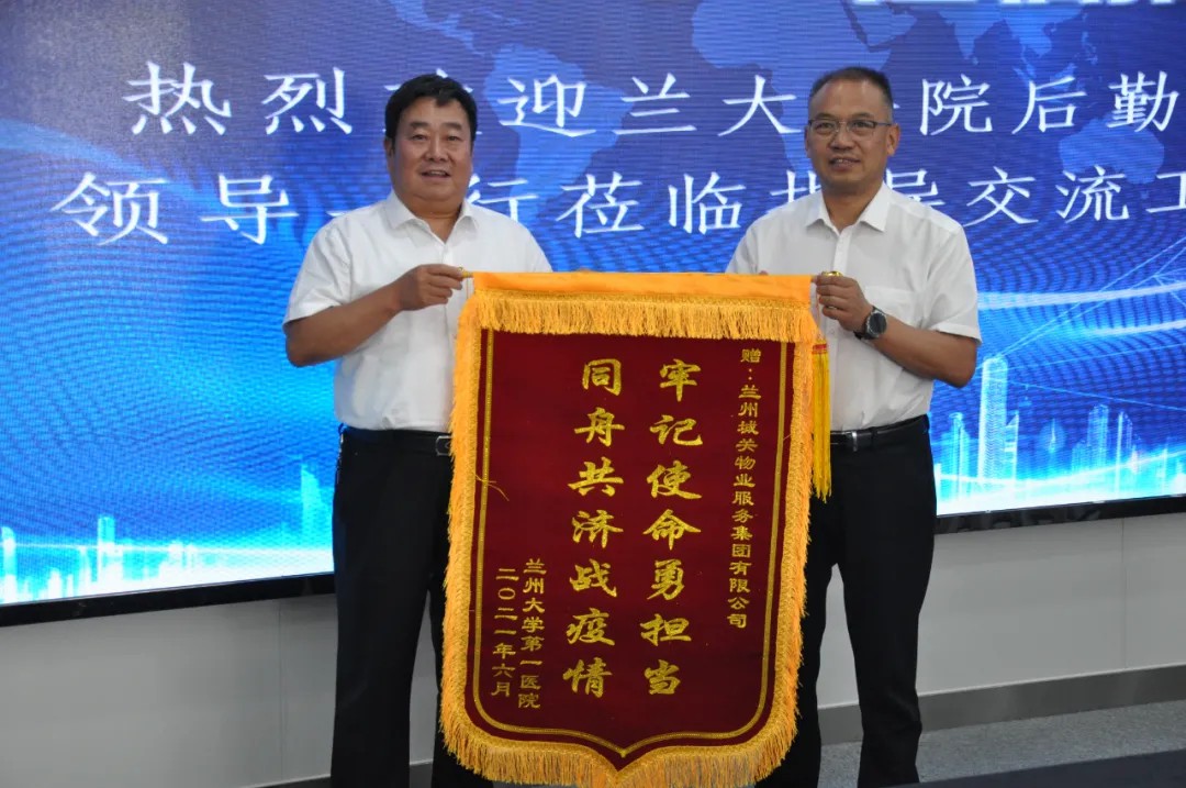 蘭州大學(xué)第一醫(yī)院后勤保障處陳處長一行人專程來到蘭州城關(guān)物業(yè)服務(wù)集團有限公司,將一面寫有“牢記使命勇?lián)?dāng) 同舟共濟戰(zhàn)疫情”的錦旗贈予蘭州城關(guān)物業(yè)服務(wù)集團有限公司,以此表達對城關(guān)物業(yè)的感謝和認可。