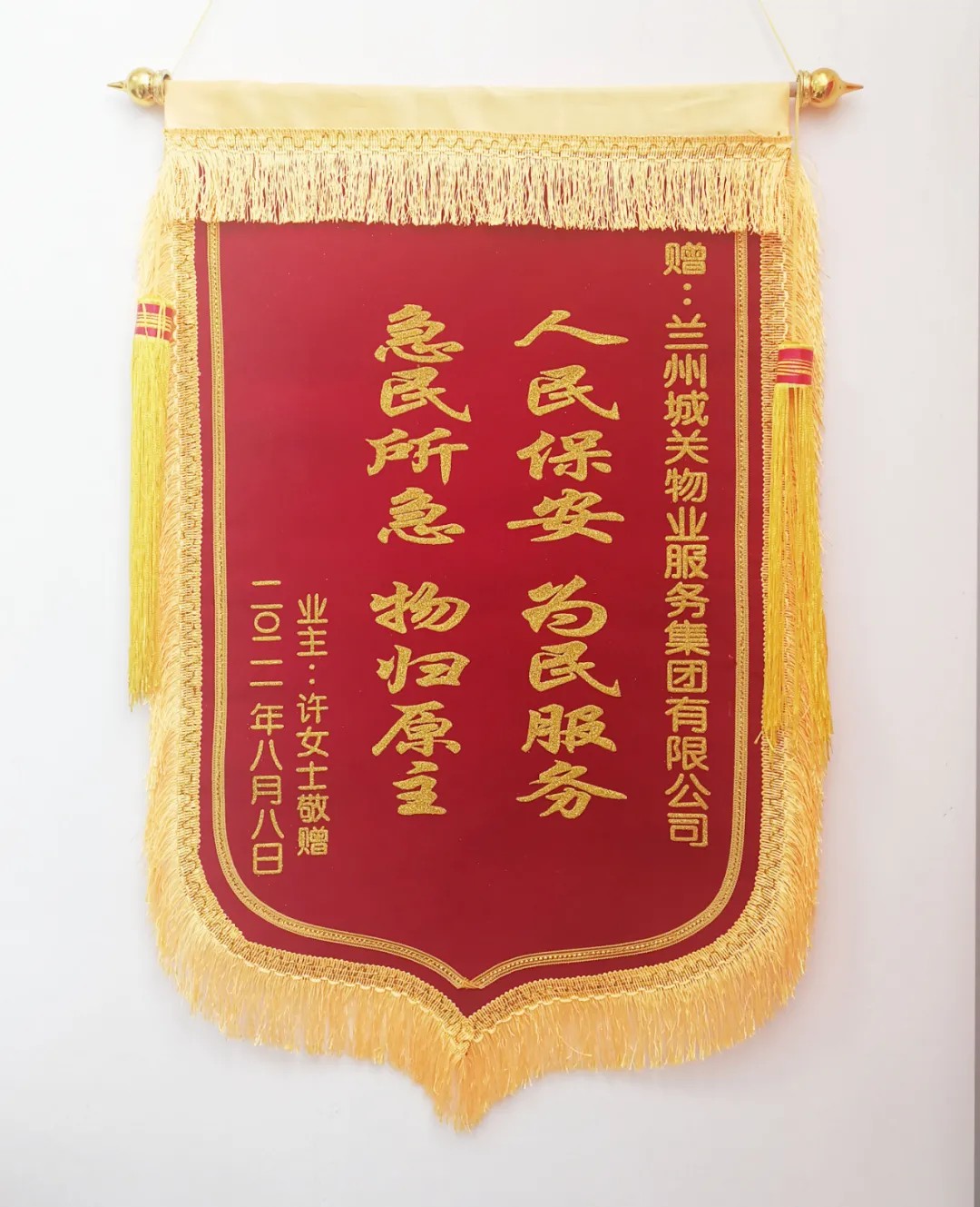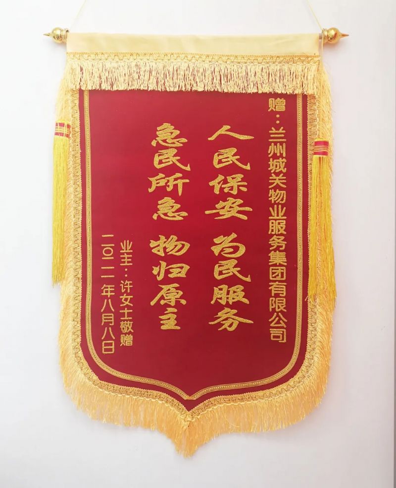 重邦康城小區(qū)業(yè)主將一面寫有“人民保安,為民服務(wù),急民所急,物歸原主”的錦旗送到我們手中。業(yè)主在進(jìn)入小區(qū)后不慎將貴重的車鑰匙遺失在小區(qū)內(nèi),物業(yè)工作人員立即幫助業(yè)主進(jìn)行尋找,最終在很快的時(shí)間內(nèi)找到鑰匙,物歸原主。業(yè)主表示感謝,送來錦旗。