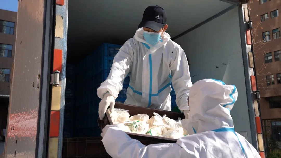 宋師傅是車隊(duì)司機(jī)之一,他開的是一輛中型貨車,一車能裝兩萬個(gè)饅頭,每天從早跑到晚,從東跑到西!疤厥鈺r(shí)期,大家都辛苦,也不是我一個(gè)人這么拼!”宋師傅黑瘦精干,說話間一車饅頭裝齊又要出發(fā)了。11月10日下午3點(diǎn)左右,宋師傅運(yùn)送饅頭的車停在安瀾祥園物業(yè)門口,“全副武裝”的物業(yè)工作人員早早等候在那里。大家搬運(yùn)、分裝、分頭上門派送。每戶10個(gè)饅頭,先按5個(gè)用塑料袋分裝,再用專門訂制的綠色環(huán)保手提袋裝起來送到業(yè)主手中。