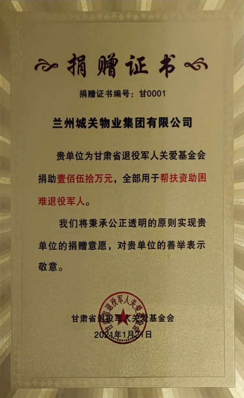 蘭州城關物業(yè)服務集團有限公司積極支持國防和軍隊建設,襄助退役軍人扶危濟困事業(yè),向甘肅省退役軍人關愛基金捐助150萬元善款,以實際行動為幫助退役軍人就業(yè)、解決退役軍人生產(chǎn)生活困難、加強軍政軍民團結工作貢獻力量、“錦上添花”。