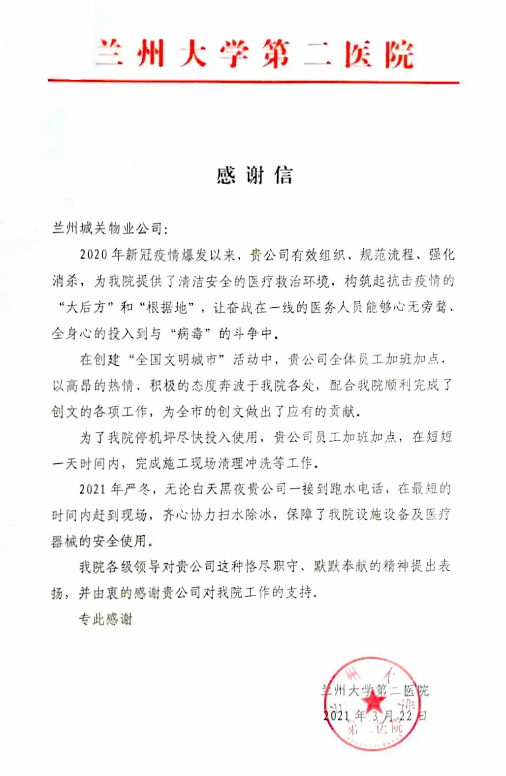 蘭州大學(xué)第二醫(yī)院后勤保障處劉處長(zhǎng)一行人專程來(lái)到蘭州城關(guān)物業(yè)服務(wù)集團(tuán)有限公司,將一面寫有“物業(yè)好管家 業(yè)主貼心人”的錦旗贈(zèng)予蘭州城關(guān)物業(yè)服務(wù)集團(tuán)有限公司總裁楊佳林手中,以此表達(dá)對(duì)于城關(guān)物業(yè)的感謝和認(rèn)可。劉處長(zhǎng)表示,2020年新冠疫情爆發(fā)以來(lái),城關(guān)物業(yè)有效組織,規(guī)范流程,為醫(yī)院提供了清潔、安全的醫(yī)療救治環(huán)境,與醫(yī)院一起構(gòu)筑起抗擊疫情的“根據(jù)地”。城關(guān)物業(yè)加班加點(diǎn)保障醫(yī)院后勤的同時(shí),積極配合醫(yī)院順利完成各項(xiàng)創(chuàng)文工作,為蘭州市創(chuàng)建全國(guó)文明城市做出了應(yīng)有的貢獻(xiàn)。